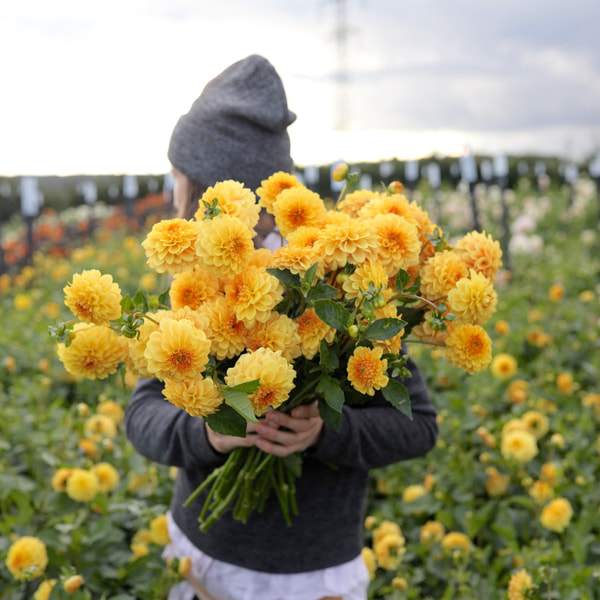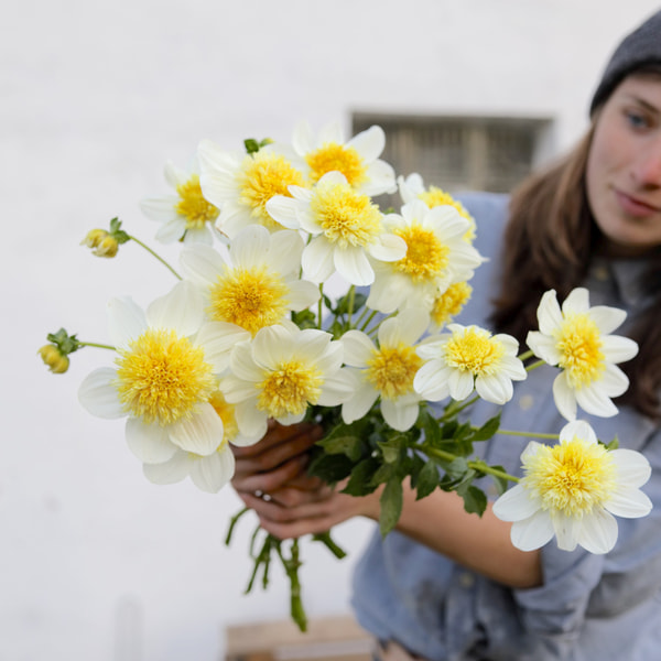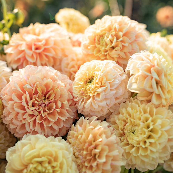 Kolekce plná žlutých, bílých a krémových jiřin s jemným podtónem růžové! Sladěné barvy, různé textury a zajímavé druhy květů.