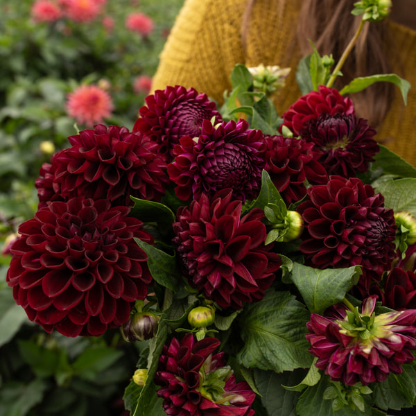 Naše nejoblíbenější vínová jiřina! Nezastaví se ani na chvíli, je obalená květy jak je sezóna dlouhá, máme celý záhon a nestačíme stříhat. Nejvíce ji používáme do svateb, kde teď podobné barvy frčí. Květy jsou středně velké, průměrně 10 cm, občas se ale najdou i menší kousky třeba do výraznějších  věnečků.