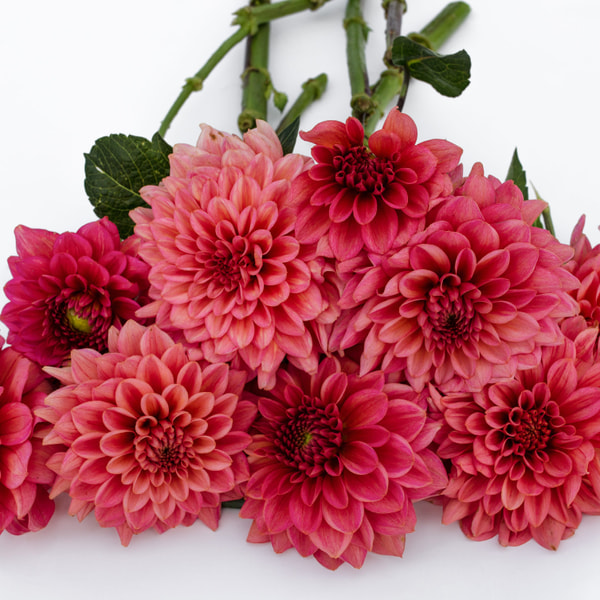 Tóny jiřin od temně červené až po růžovou! Elegantní kombinace barev, růžová dodá karmínové šmrnc a trochu ji rozsvítí. Různé